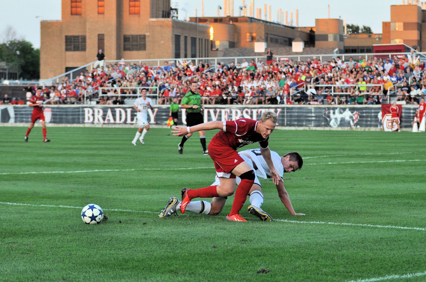 Despite leading for 57 minutes, the Bradley men’s soccer team lost 2-1 to Southern Illinois-Edwardsville on Friday in the Missouri Valley Conference semi-finals. A goal in the 22nd minute by senior Cody Lofgren wasn’t enough to fend off the Cougars.