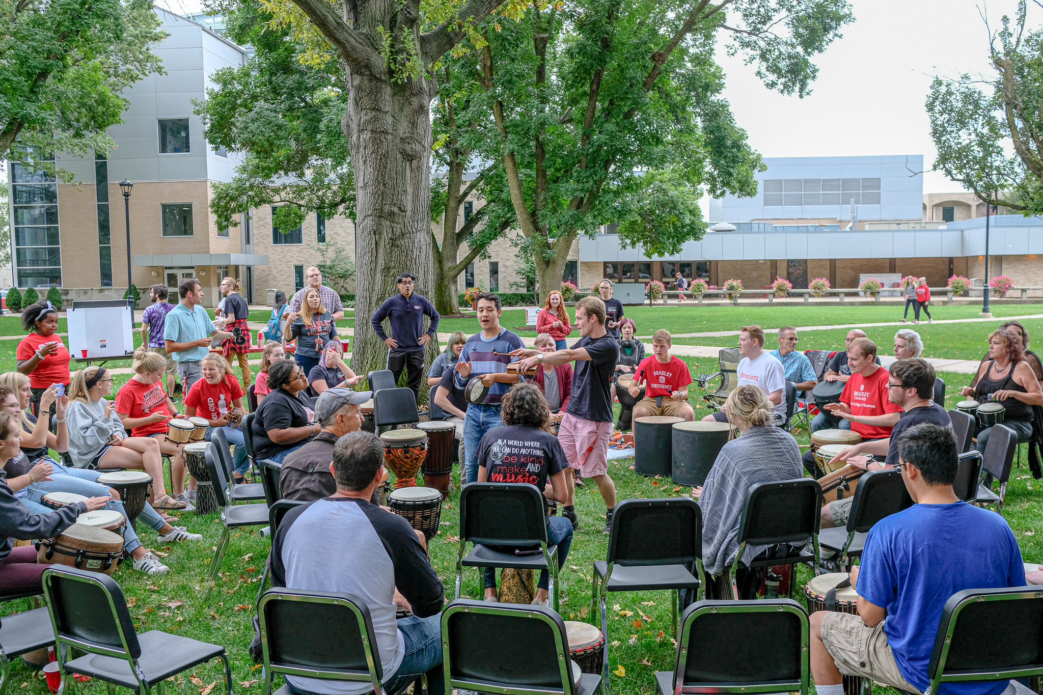 Students, staff and community members formed a circle of free-flowing rhythm on Olin Quad Sunday evening. Together, they played in a drum circle to help