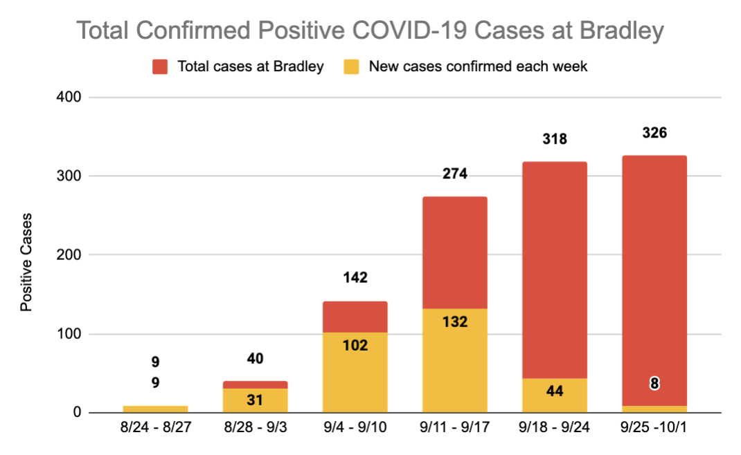 Bradley’s COVID-19 dashboard indicates eight total positive cases from both on and off-campus testing were recorded from Sept. 25 – Oct. 1. This marks a