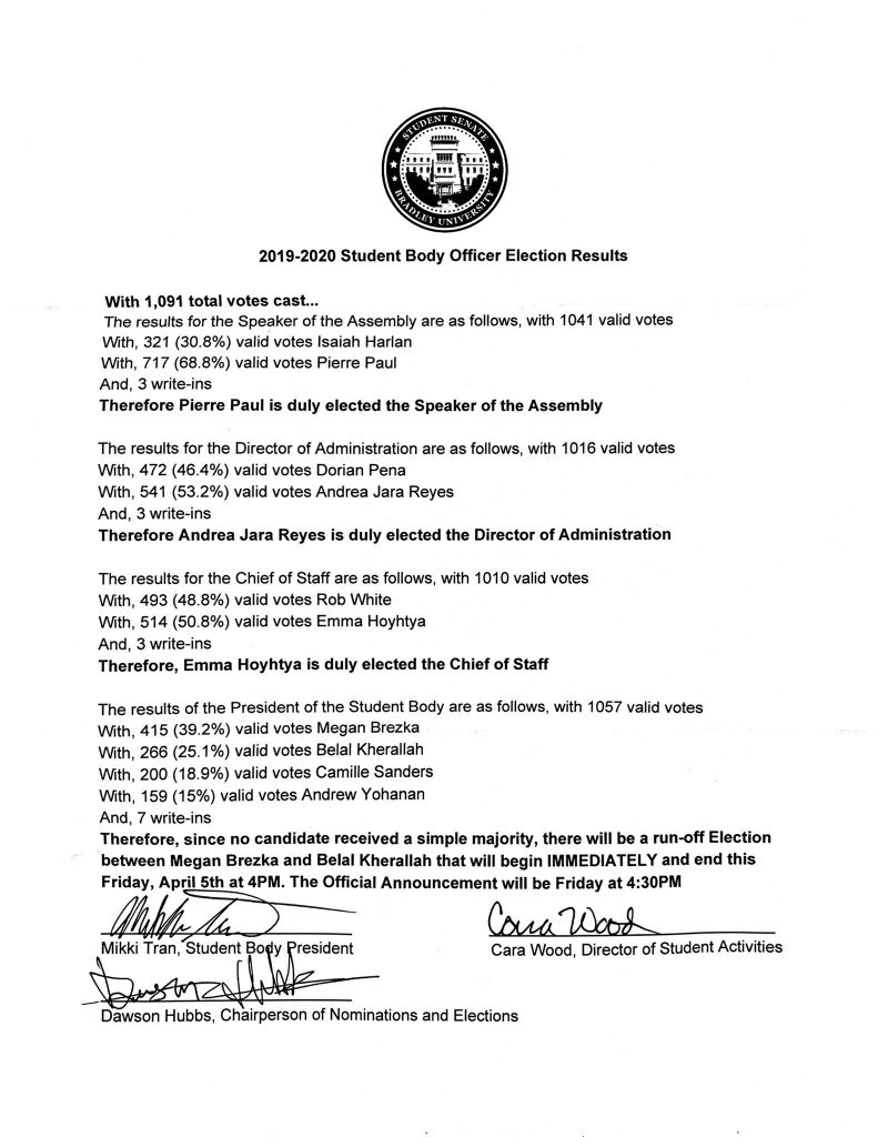 No presidential candidate secured a simple majority, resulting in a runoff election between the ones with the highest percentages, Megan Brezka and Belal Kherallah.