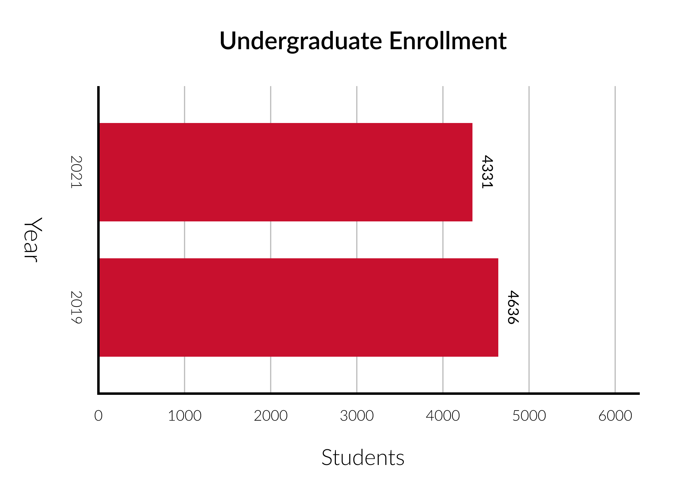 The COVID-19 pandemic has taken a toll on Bradley’s undergraduate enrollment. While 2019’s fall undergraduate enrollment was at 4,636 students, 2021’s fall enrollment is at 4,331 students — almost a 7% decline.