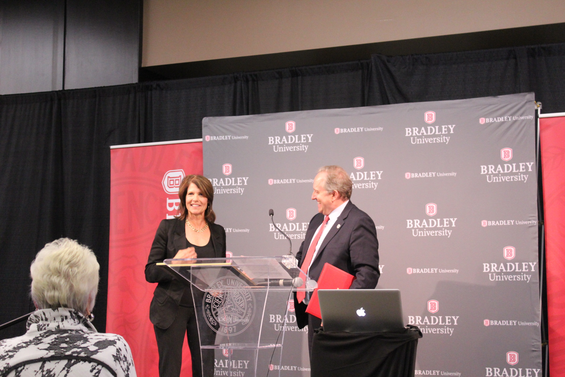 Standifird compared Bustos to Lydia Moss Bradley’s belief that Bradley will stand against the tests of time as long as the U.S. government lasts and Bradley students that wish to sustain the U.S. government. Also compared was their hands-on work in the public through numerous projects.