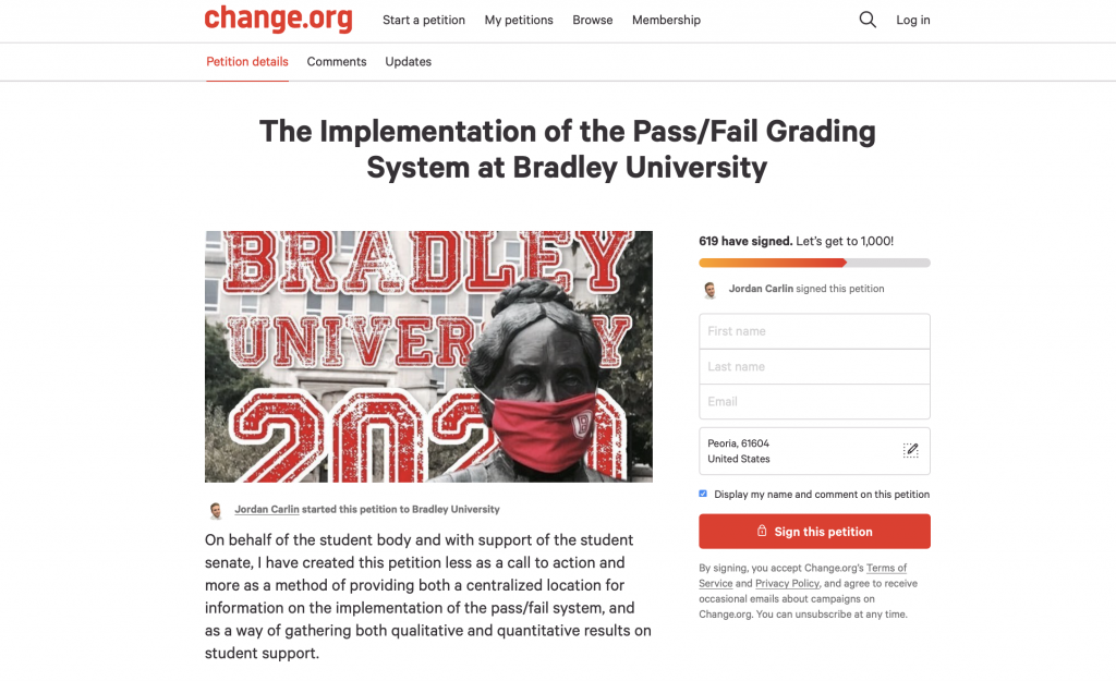 There is currently a petition on change.org in favor of implementing the grading system at Bradley that has over 600 signatures, as of publication.