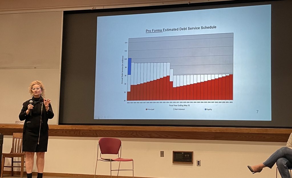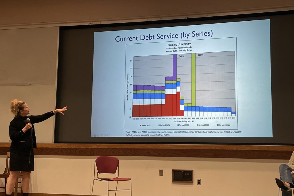 Cox opened the event with a presentation, a section of which was dedicated to explaining Bradley’s strategies regarding debt. She stated that Bradley has over $100 million in debt, and further claimed that based on her experience upon arriving at the university, Bradley did not use a proper debt strategy.