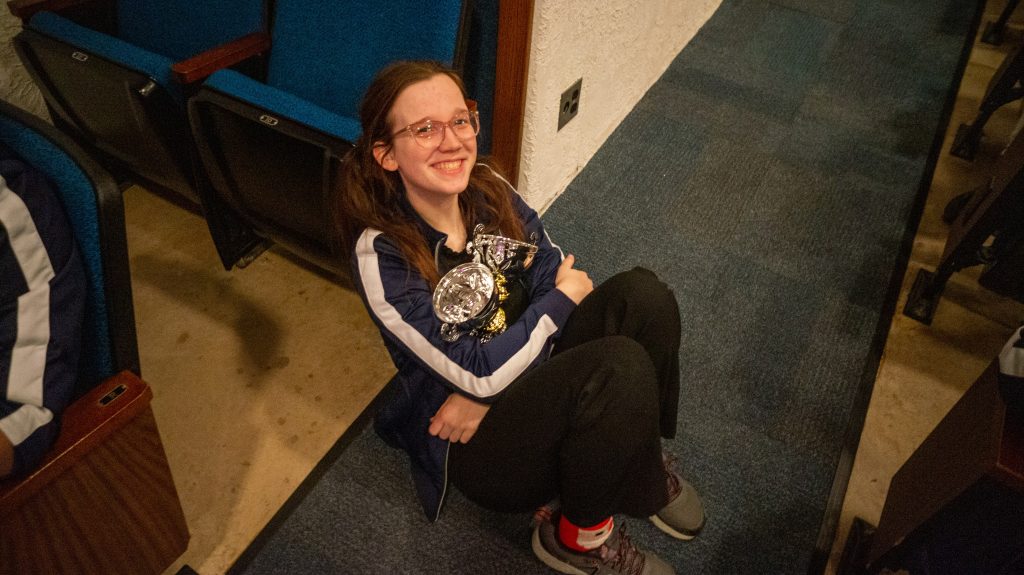 Jessica Taylor sitting with trophies. Photo via Jessica Taylor