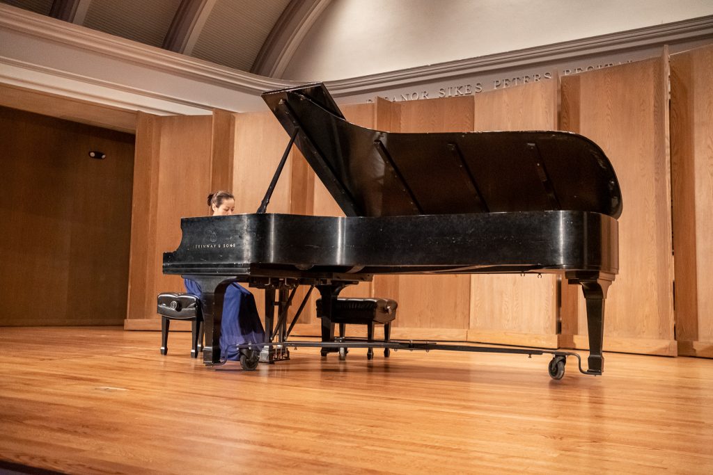 When the lights dimmed at Dingeldine Music Center, a woman in a blue dress walked to the large piano center stage. Once her hands touched the keys, the audience became quiet, as some closed their eyes and listened to the variations of sound.