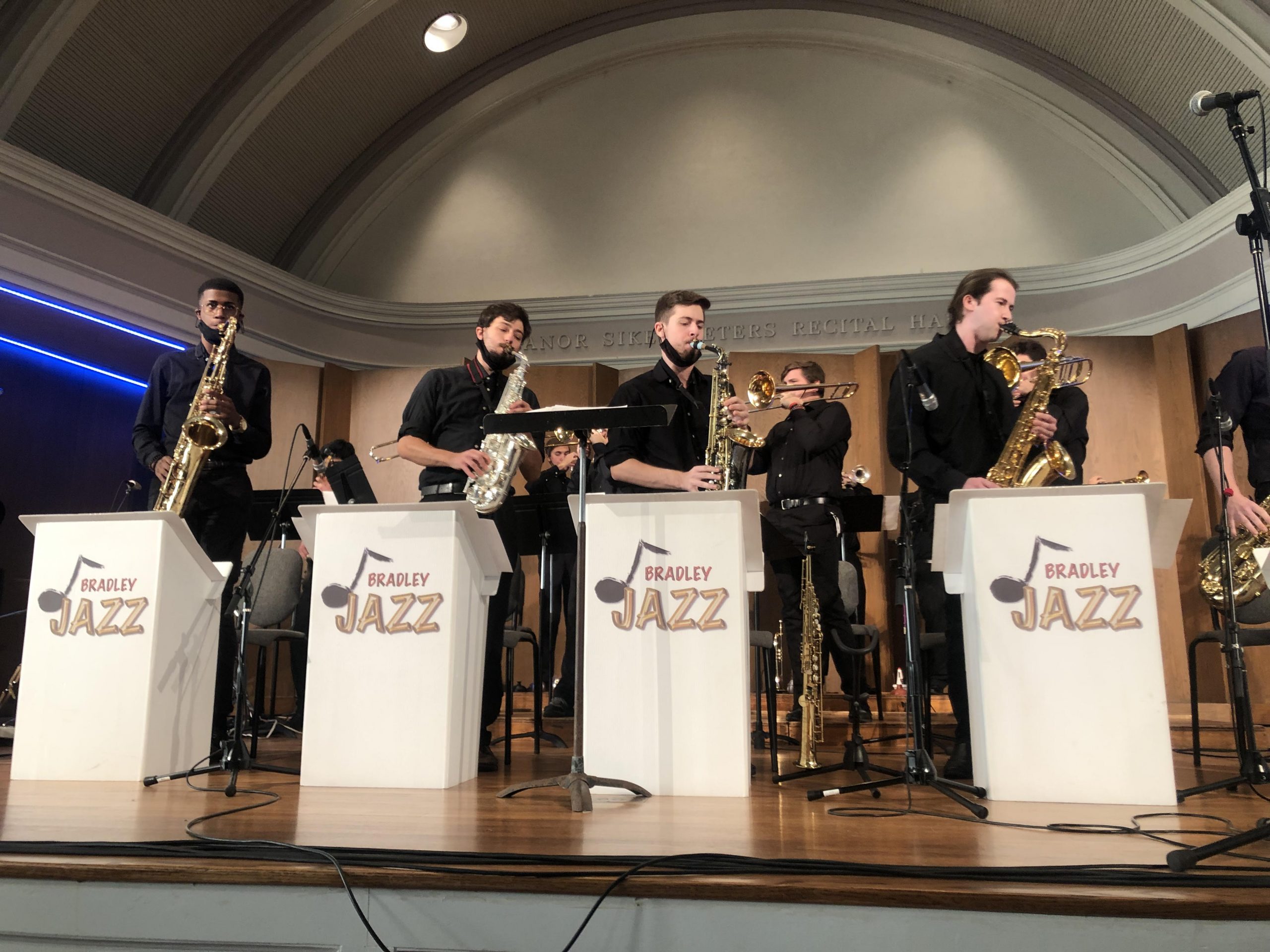 The chair of Bradley’s music department, Todd Kelly, and the director of Vocal Jazz, Lara Reem, conducted this live performance, their first such since February 2020.
