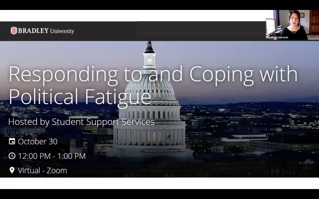 To combat those stressors, Elizabeth Gorman, director of Student Support Services, held a panel discussion on the topic of political fatigue on Zoom this past Friday.