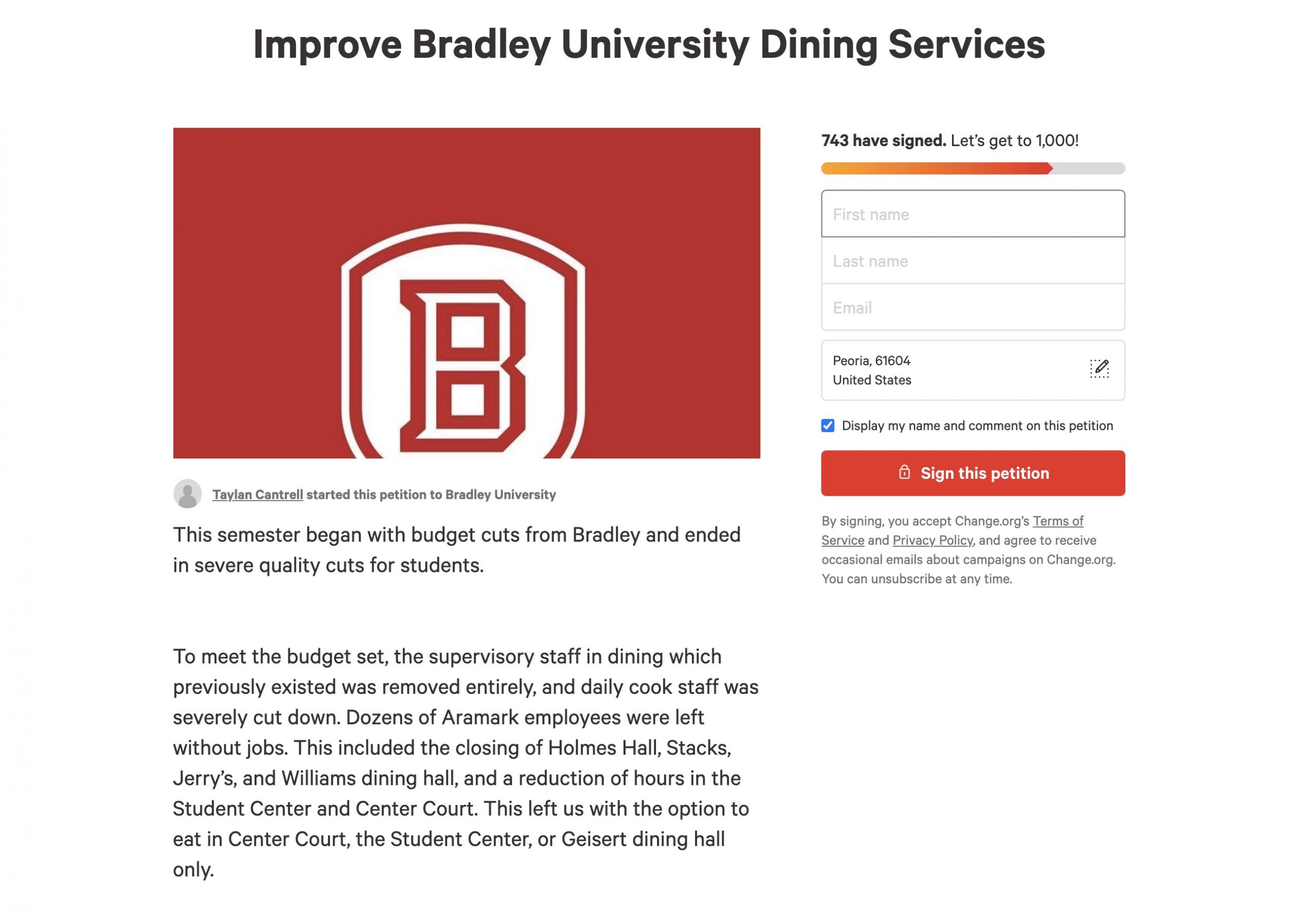 A petition on Change.org has called for the university to look into changes that have been made to Bradley’s dining services and the impact it has had on the student body.
