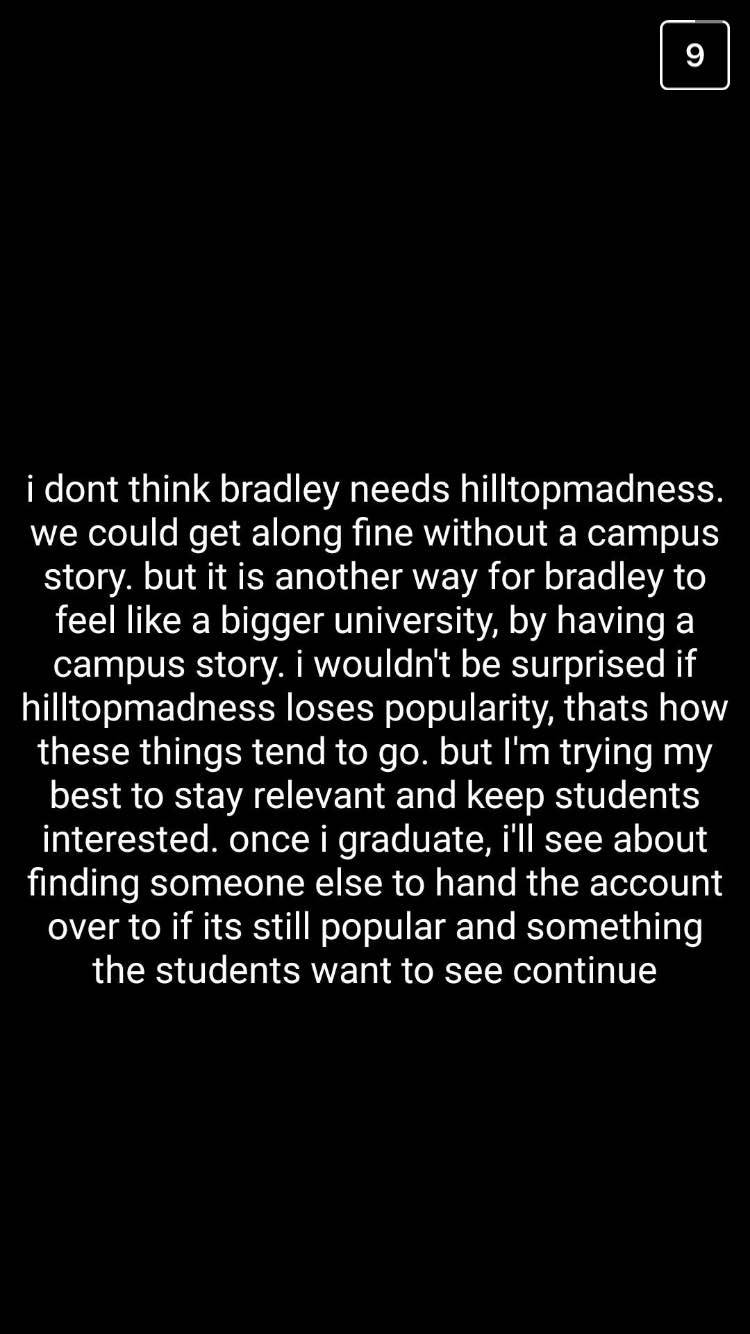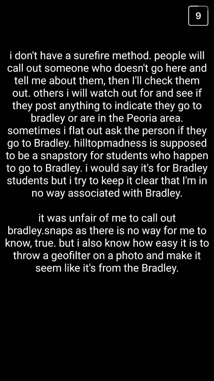 ![A: I don't have a surefire method. People will call out someone who doesn't go here and tell me about them, and then I'll check them out. Others I will watch out for and see if they post anything to indicate they go to Bradley or are in the Peoria area. Sometimes, I flat out ask the person if they go to Bradley. "Hilltopmadness" is supposed to be a snapstory for students who happen to go to Bradley. I would say it's for Bradley students, but I try to keep it clear that [the account is] in no way associated with Bradley. It was unfair of me to call out "bradley.snaps," as there is no way for me to know, true. But I also know how easy it is to throw a geofilter on a photo and make it seem like it's from Bradley.](http://www.bradleyscout.com/wp-content/uploads/2016/04/IMG_4035-169x300.jpg)