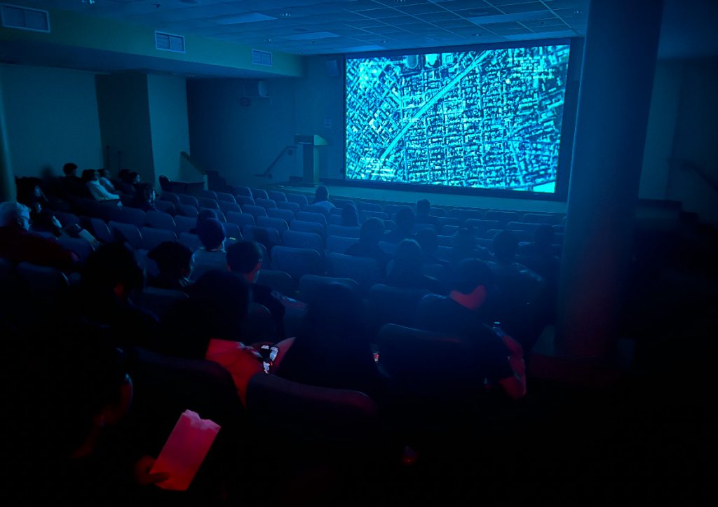 The screen flashed from technical explanations of algorithms to the red and blue lights of police cars as “Computers v. Crime” played in the Marty Theatre on Oct. 22.