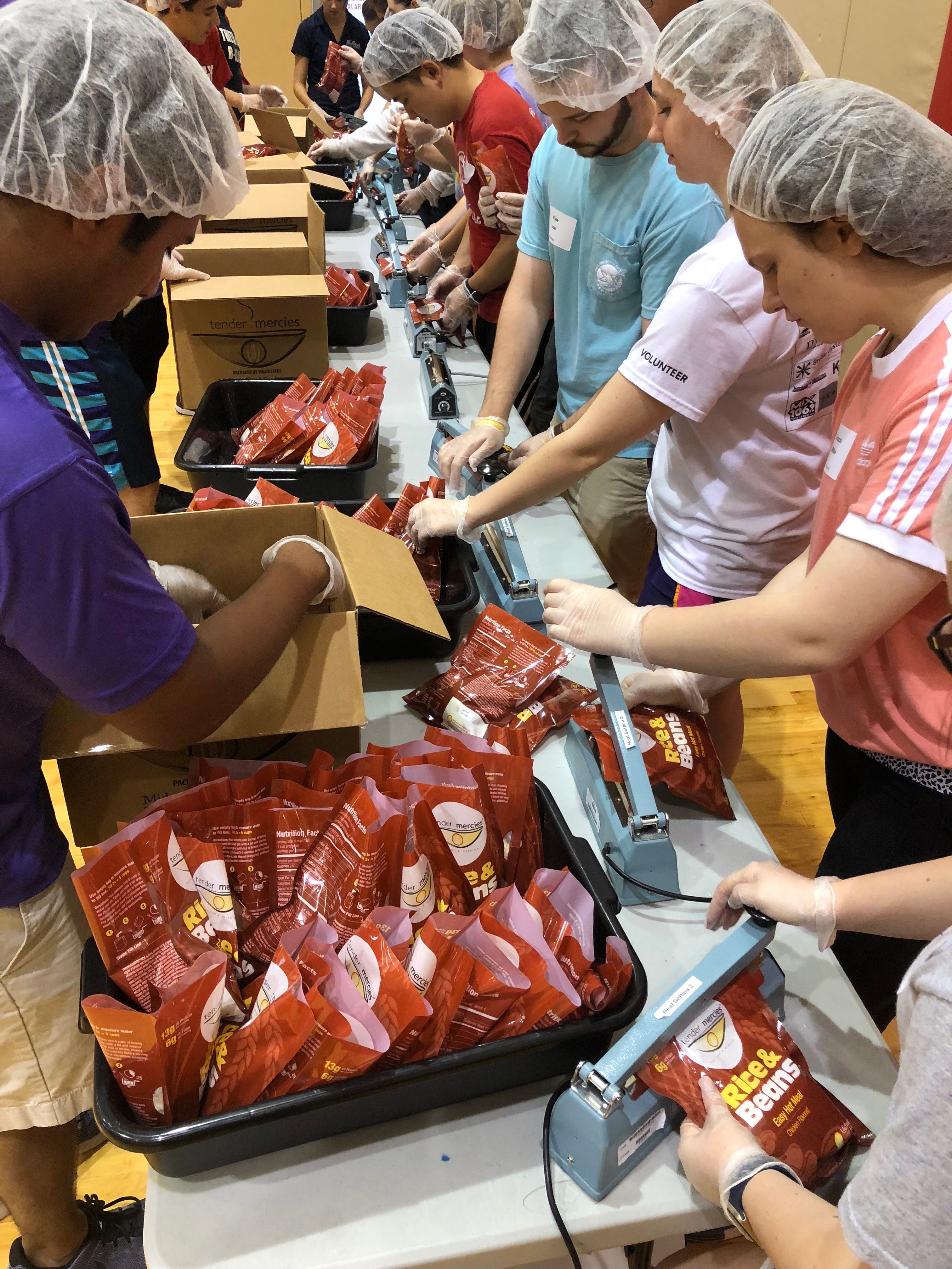 Nick Topping, a junior biology major, helped package meals for the Midwest Food Bank, to be distributed to local food pantries and schools as requested. Packaging occurred in the Markin performance court.