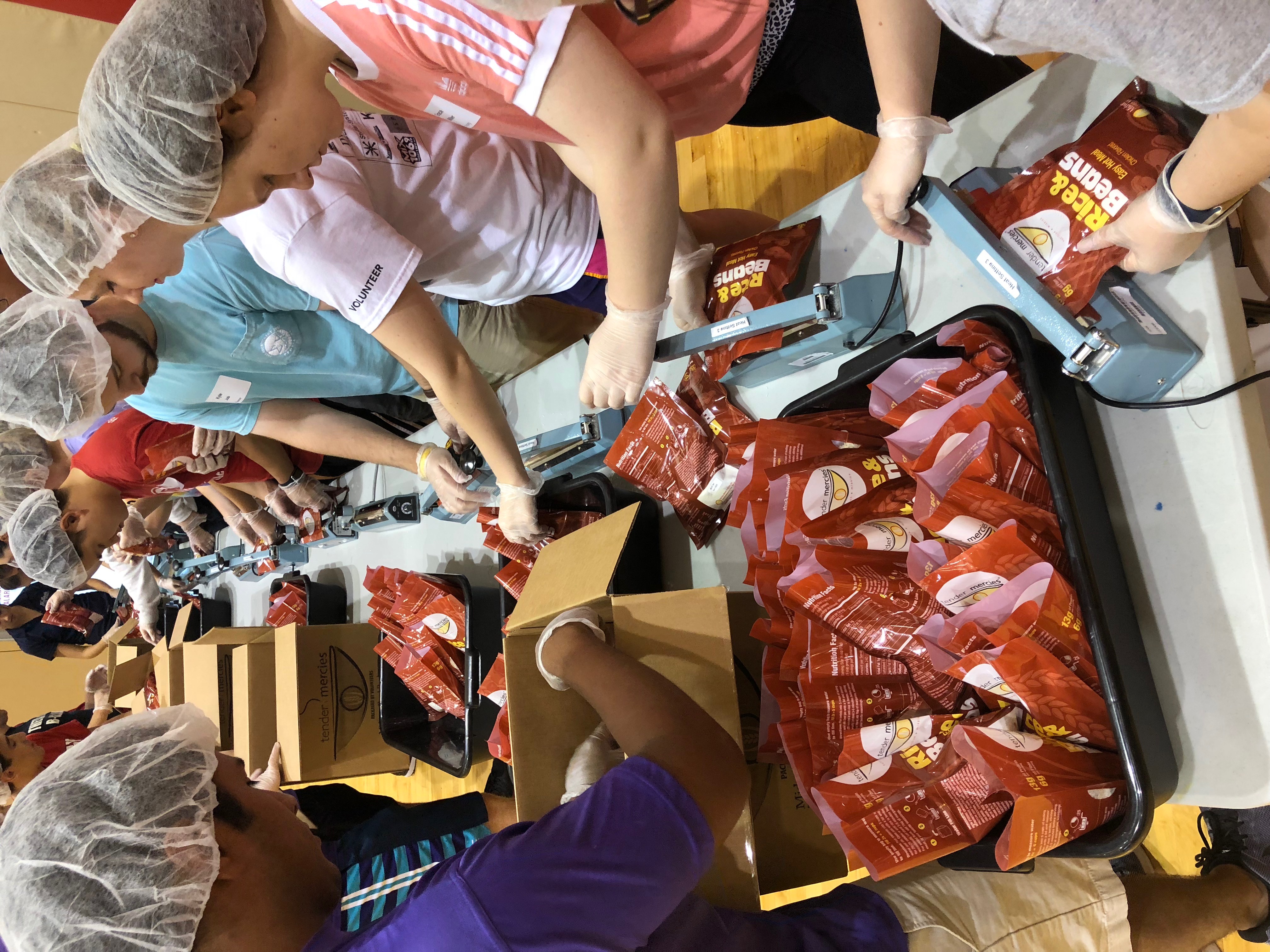 Nick Topping, a junior biology major, helped package meals for the Midwest Food Bank, to be distributed to local food pantries and schools as requested. Packaging occurred in the Markin performance court.