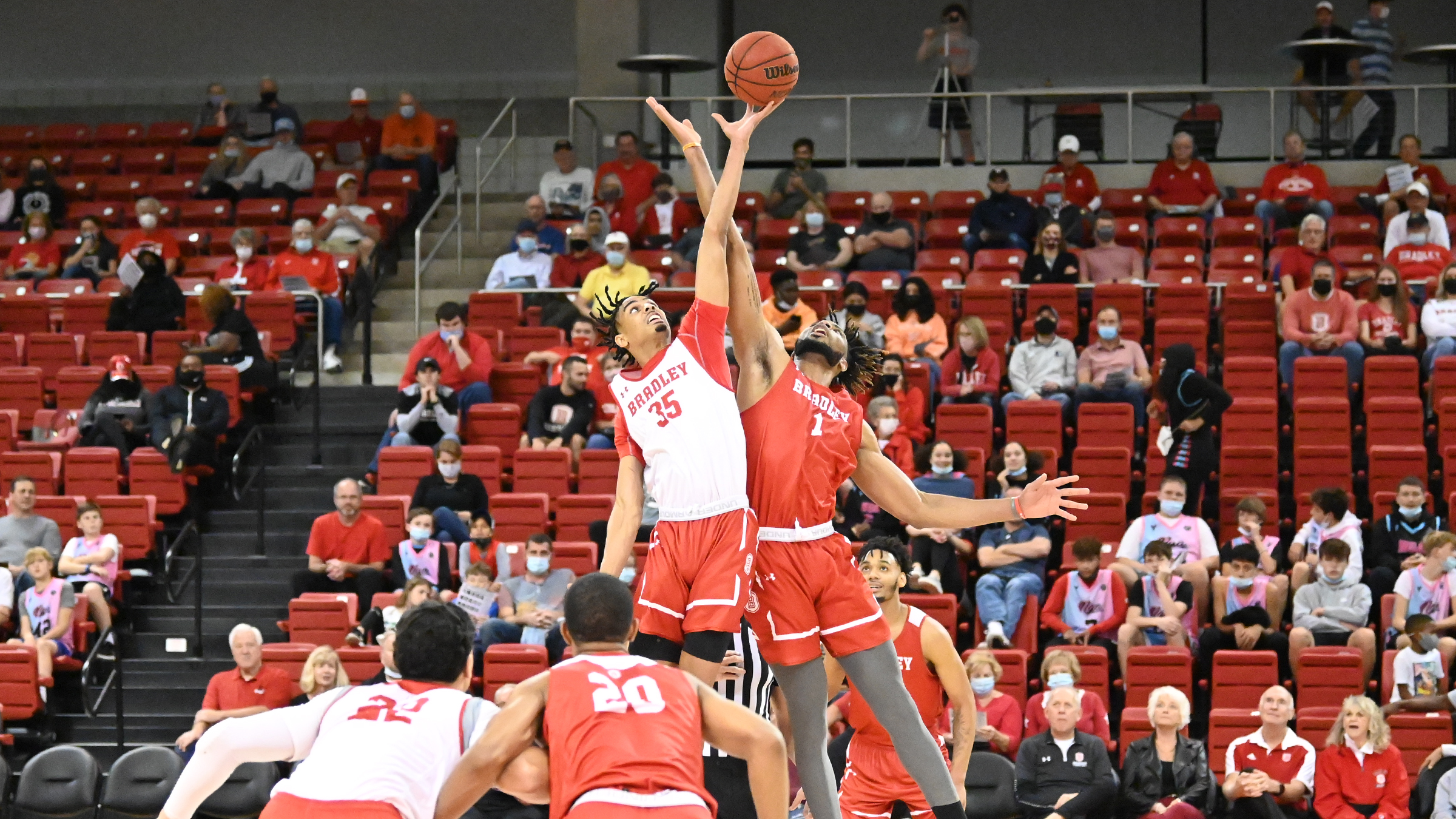 For the first time since Feb. 29, 2020, fans were able to see Bradley’s men’s and women’s basketball teams play publicly, live and in-person at the Red and White Scrimmage on Wednesday. Renaissance Coliseum played host to nearly 1,000 fans as they received their first impressions of the 2021-22 Braves’ cagers. The scrimmage also marked the first time that the newcomers on both squads could showcase what they can bring to the table this year, as the men’s team eyes its third MVC title in four years and the women seek to repeat as conference champions.