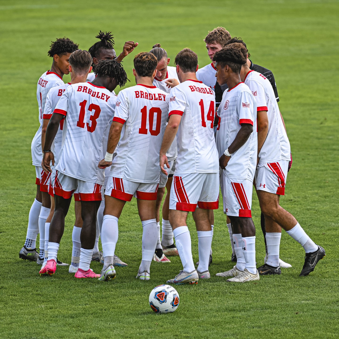 Bradley soccer huddles together. Photo courtesy of Bradley Athletics.