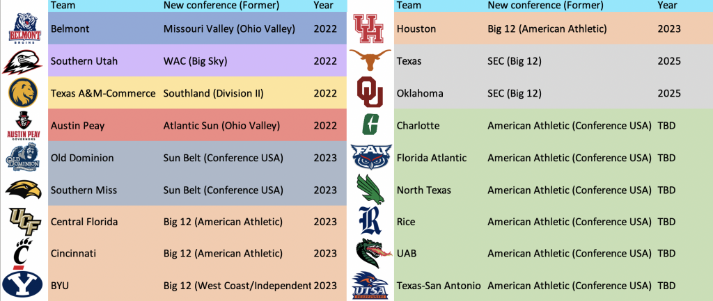 Rather than list all the upcoming changes in conferences, the graphic below summarizes the dizzying amount of institutions moving around in the college sports landscape. The graphic doesn’t even account for 10 schools that recently switched conferences before the 2021-22 season.