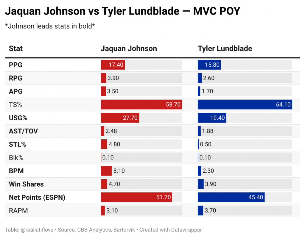 Johnson was integral to a team that was thought to be in a rebuilding season after losing four of its five starters and three all-conference players, yet ended the regular season as the MVC’s second-ranked team. The Braves were 13.3 points better per 100 possessions with him on the court compared to when he was off.