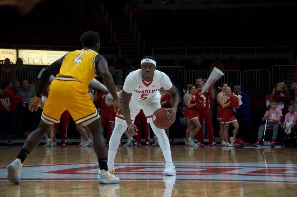 Darrell Brown dribbles near center-court in Bradley’s victory over Valparaiso. Photo by Kayla Johnson