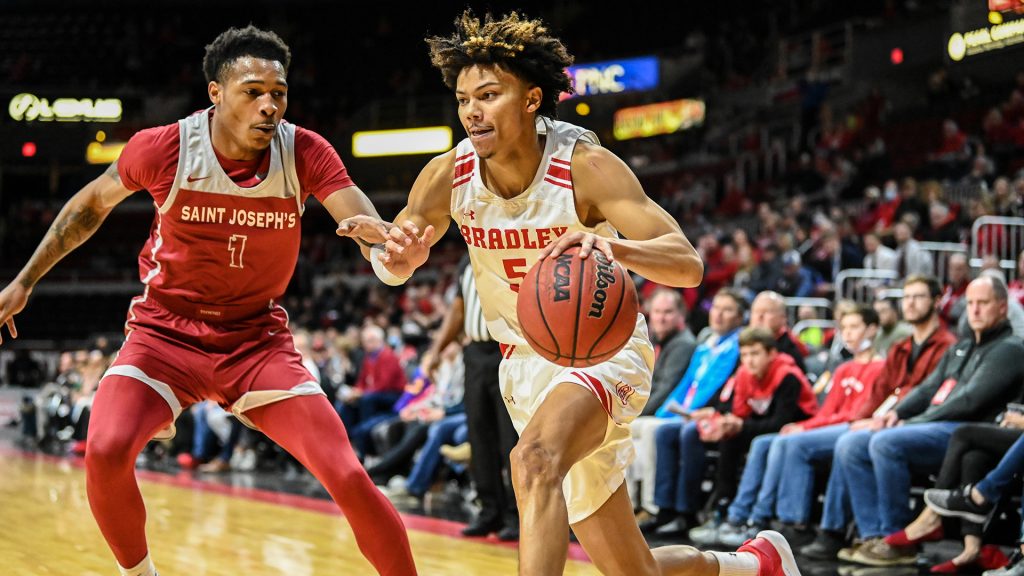 Mikey Howell drives along the baselines against St. Josephs. Photo courtesy of Bradley Athletics.