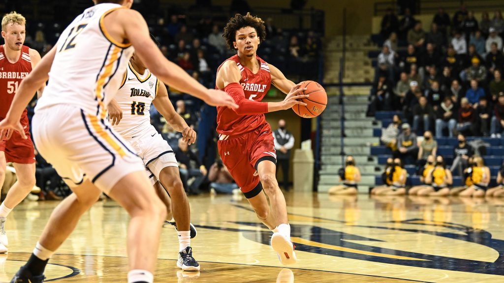 Mikey Howell drives up the court against Toledo. Photo courtesy of Bradley Athletics.