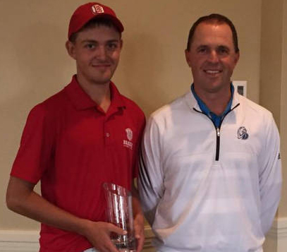 Freshman golfer Drake Bushong (left) poses with his trophy after gar- nering medalist honors at the Zach Johnson Invitational. Photo via BradleyBraves.com.