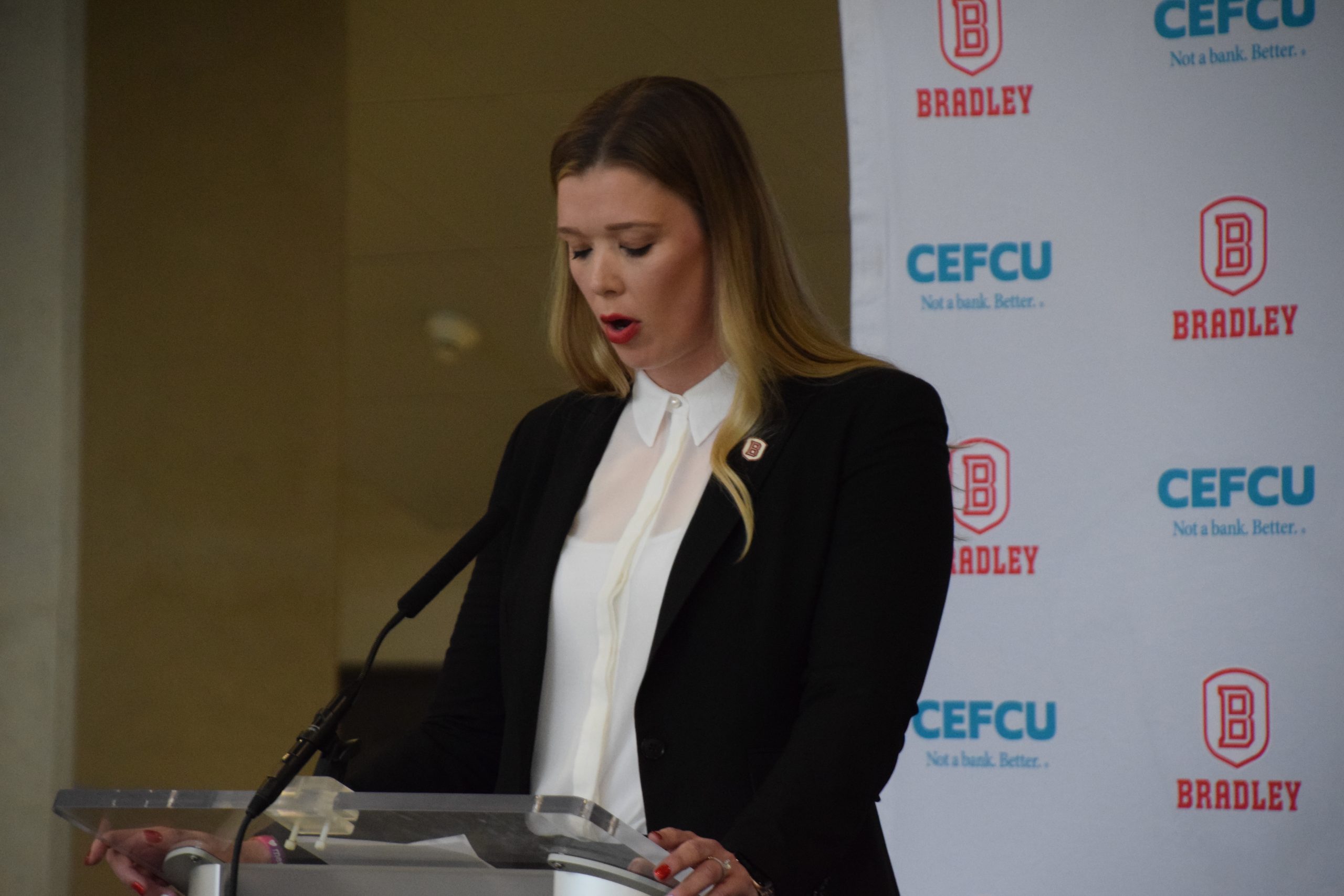 Kate Popovec speaks during her introductory press conference. Photo by Jonathan Michel