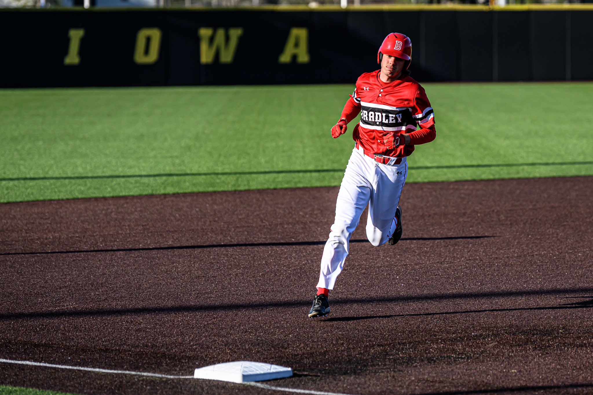Timmy O’Brien rounds third after hitting a home run against Iowa on April 17, 2024 in Iowa City. Photo courtesy of Bradley Athletics.