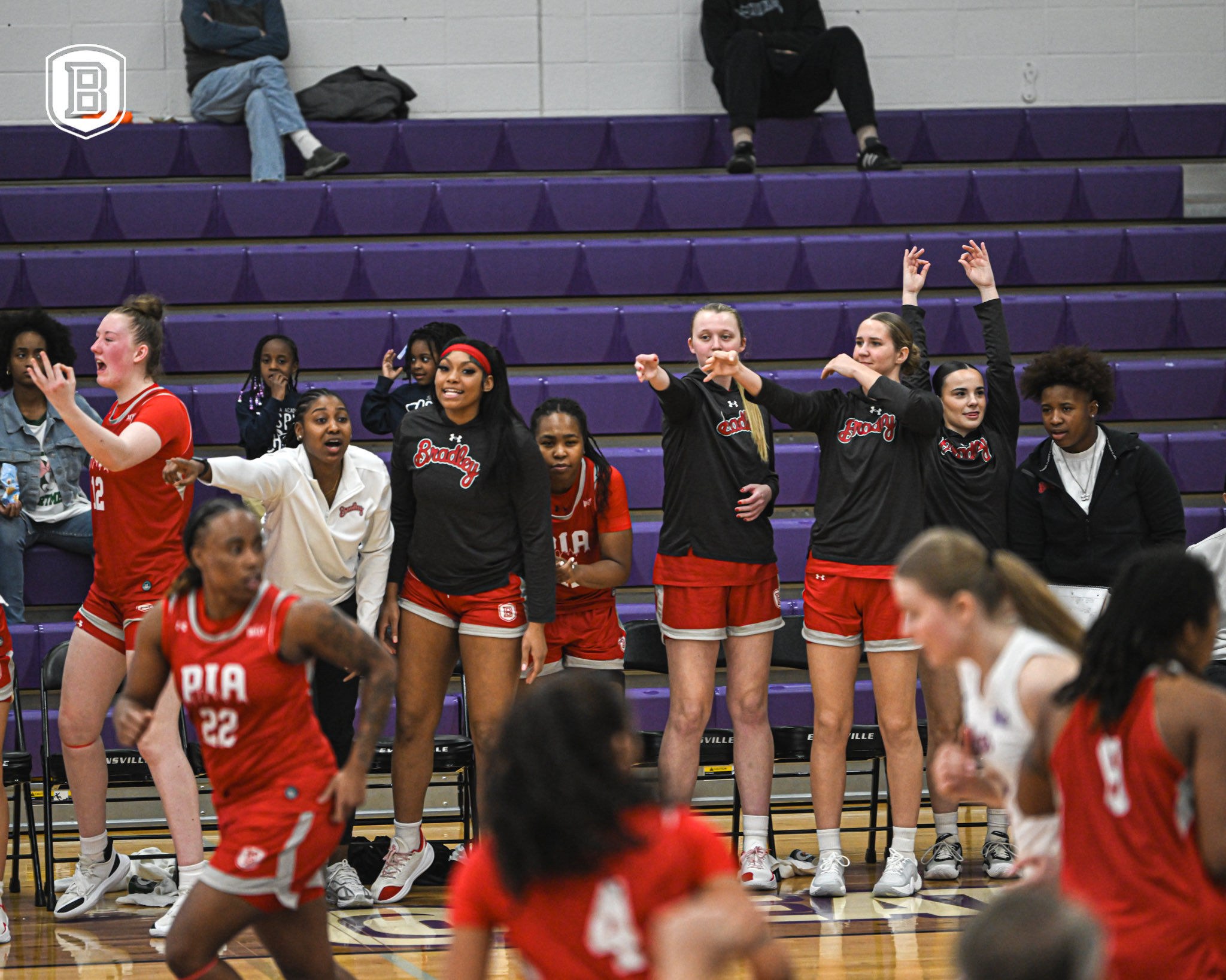 Bradley’s bench celebrating after a made basket against Evansville. Photo courtesy of Bradley Athletics.