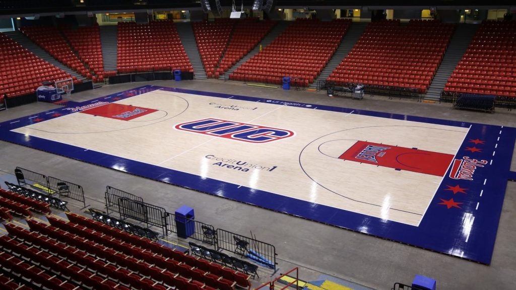 Abandoning the classic golden, yellow hardwood for a bone white one, Illinois-Chicago makes good use of their red, white and blue logo. Another interesting feature of this court is its blue baseline with the alternate Flames logo, featuring two red stars along each side. Overall, it’s a unique court for the only MVC team in Chicago.