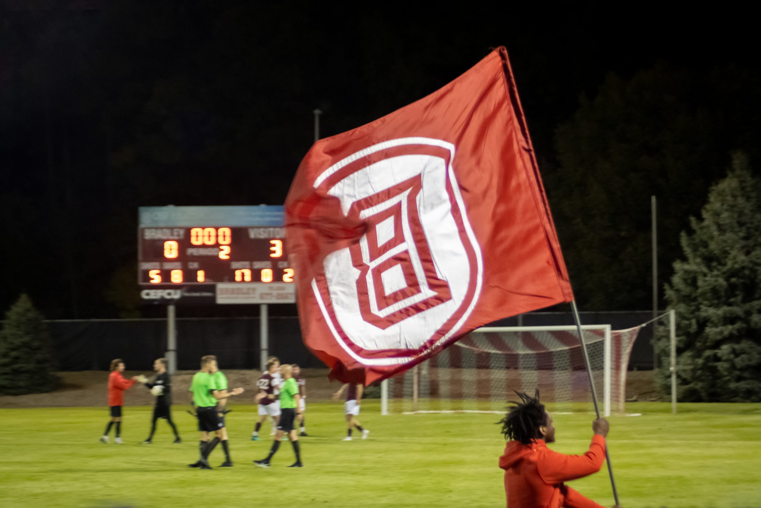 A Bradley fan runs with the school flag at the homecoming soccer game. Photo by Jenna Zeise.