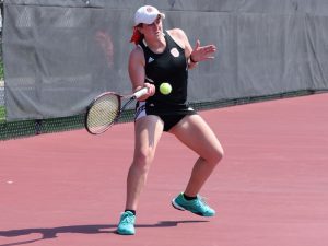 With a default loss at No. 6 singles and down 2-0 in the match, sophomore Malini Wijesinghe started the comeback effort for the Braves, making quick work in her singles match winning 6-0, 6-2. Freshman Natalia Barbery followed with a 6-3, 6-2 win at the No. 2 place, and junior Aimee Manfredo evened the match score at 3-3 with a 3-6, 6-1, 6-3 come-from-behind win.