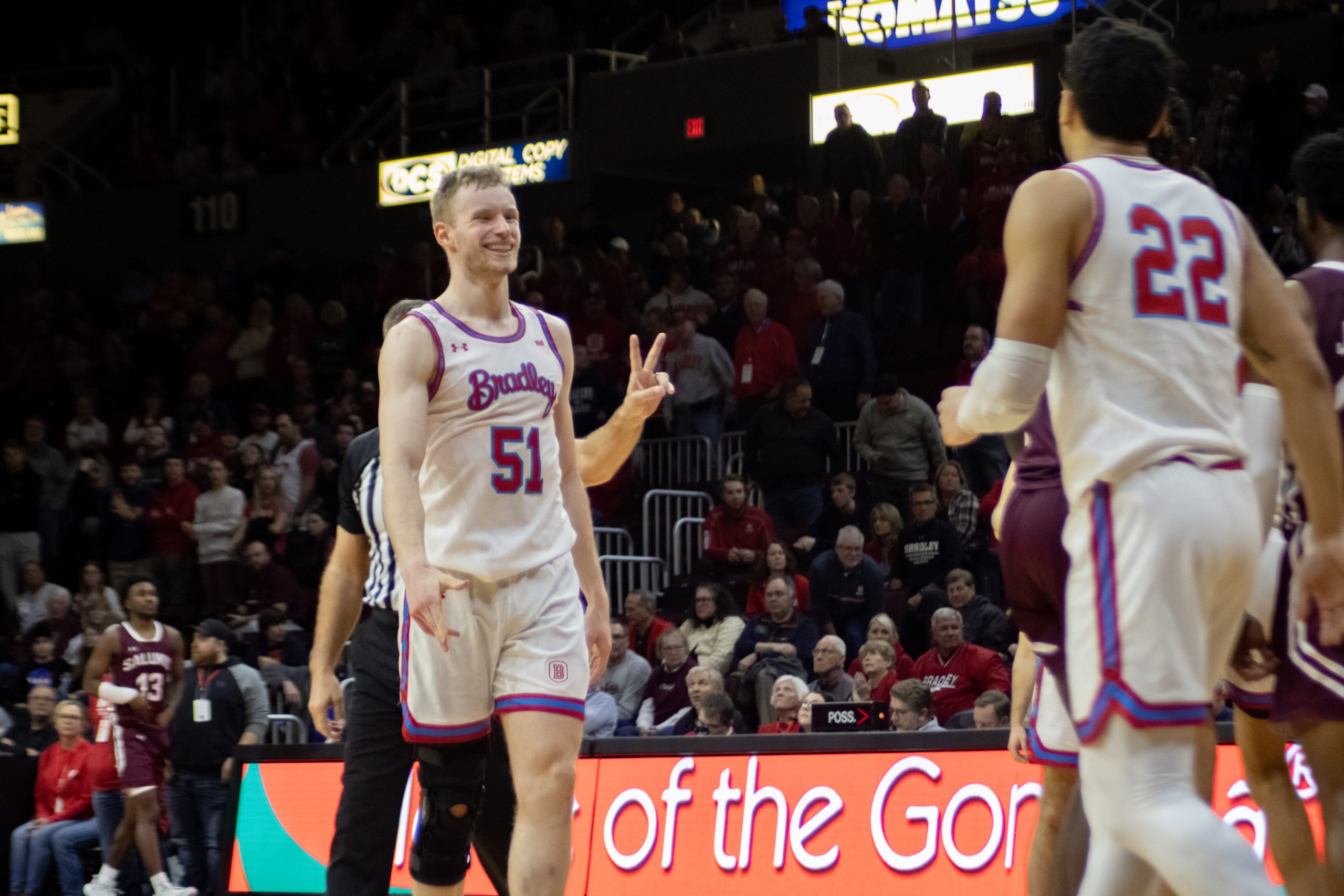 But trailing 48-46 with just over 20 seconds left in the game, Bradley junior forward Rienk Mast sank the biggest shot of the game, the Braves’ season and his career with a 3-pointer from the wing through a foul and finished off the 4-point play with a free throw to deliver Bradley’s eighth win in a row against one of the most challenging teams in the Missouri Valley Conference.