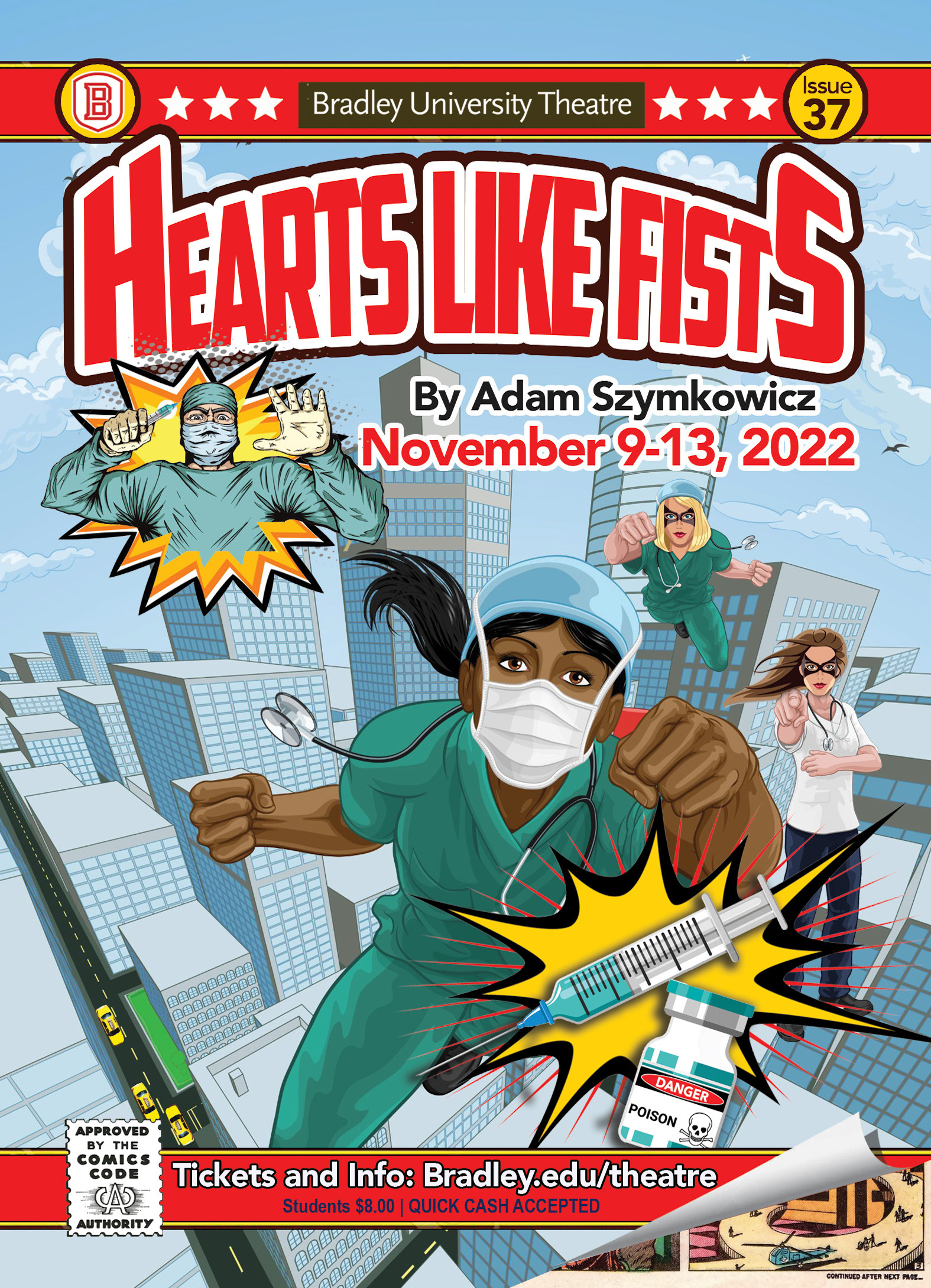 Directed by professor Scott Kanoff and performed by Bradley University Theatre, “Hearts Like Fists” feels like a combination of “The Batman” and “Grey’s Anatomy” against a backdrop of primary colors. It doesn’t take itself too seriously, and that’s what makes it such a fun ride.