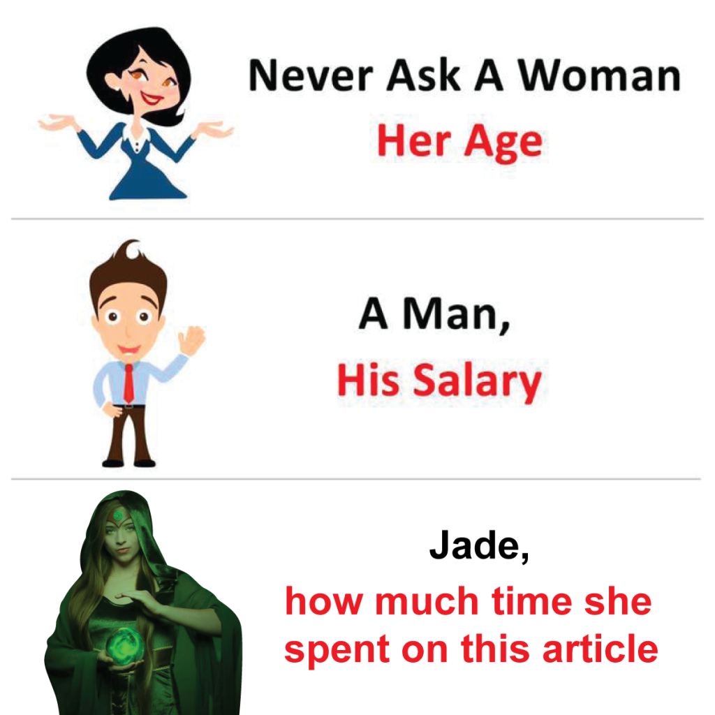 The meme format is relatively simple: a vertical stack of three photos. The first has clip art of a woman and says, “Never ask a woman her age.” The second photo has clip art of a man and says, “A man, his salary.” The third, however, packs the punchline and is different every time.